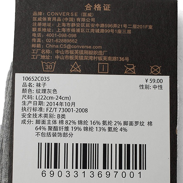 匡威10652C035-80% 棉 18% 锦纶 2% 氨纶