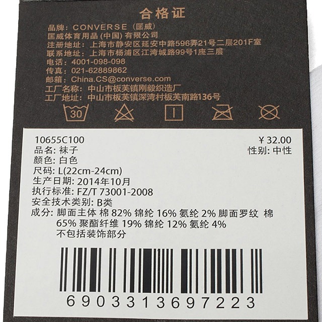 匡威10655C100-80% 棉 18% 锦纶 2% 氨纶