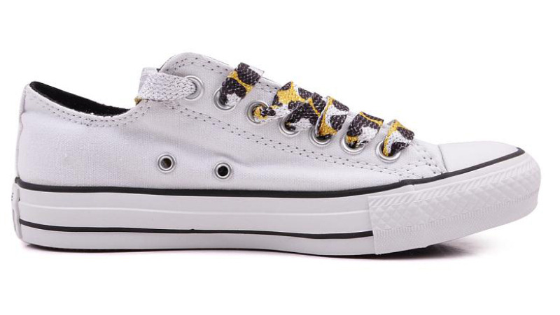 匡威541491-帆布面料,鞋带上豹纹图案的印刷,还加了仿金属的金葱线。鞋舌上的鞋标也采用了金葱线的设计,让球鞋不无聊